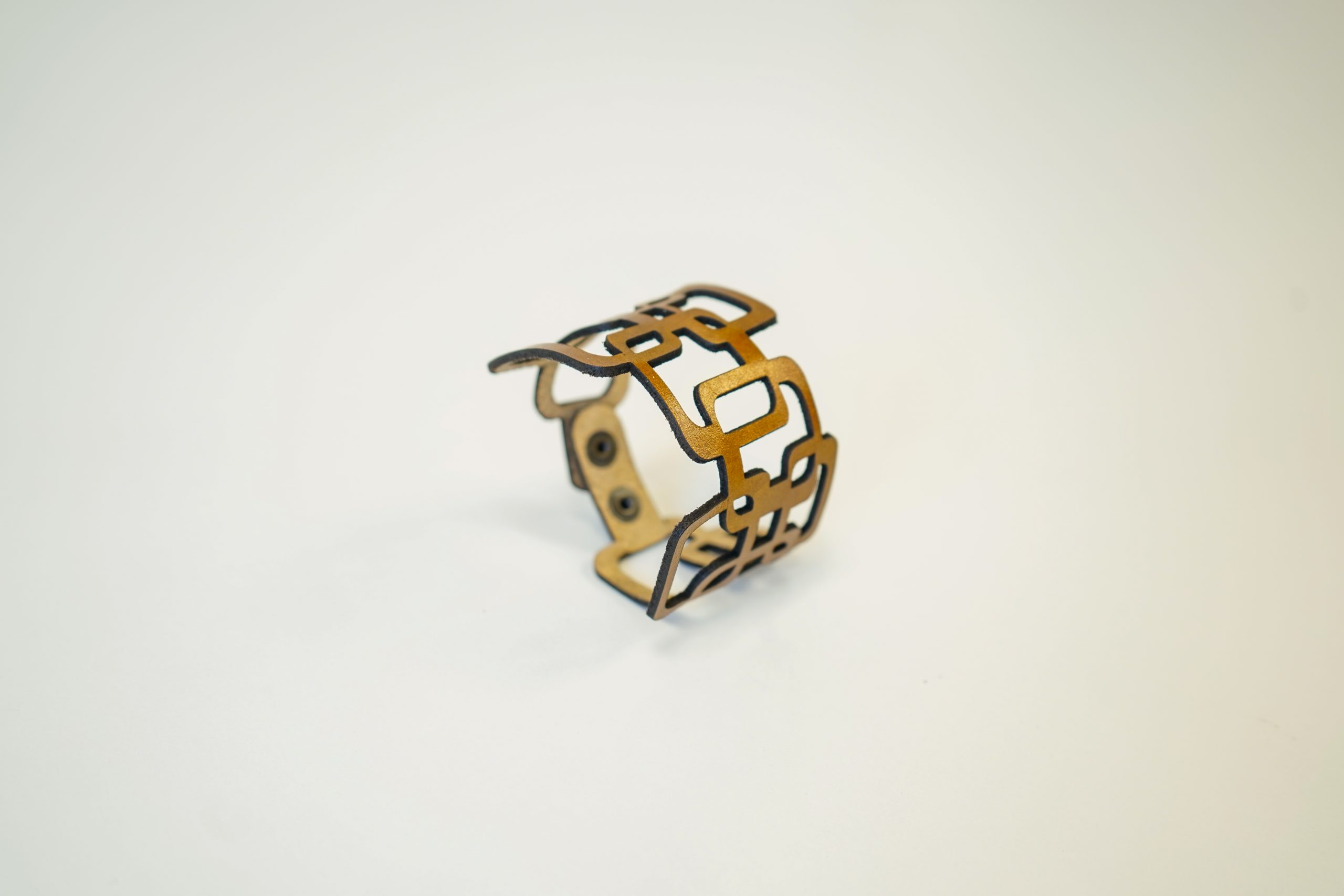 Brazalete Geo: La unión perfecta entre tecnología y artesanía. Cuero de curtición vegetal con corte láser de precisión y teñido a mano. Una pieza ligera, geométrica y única que redefine el accesorio contemporáneo.